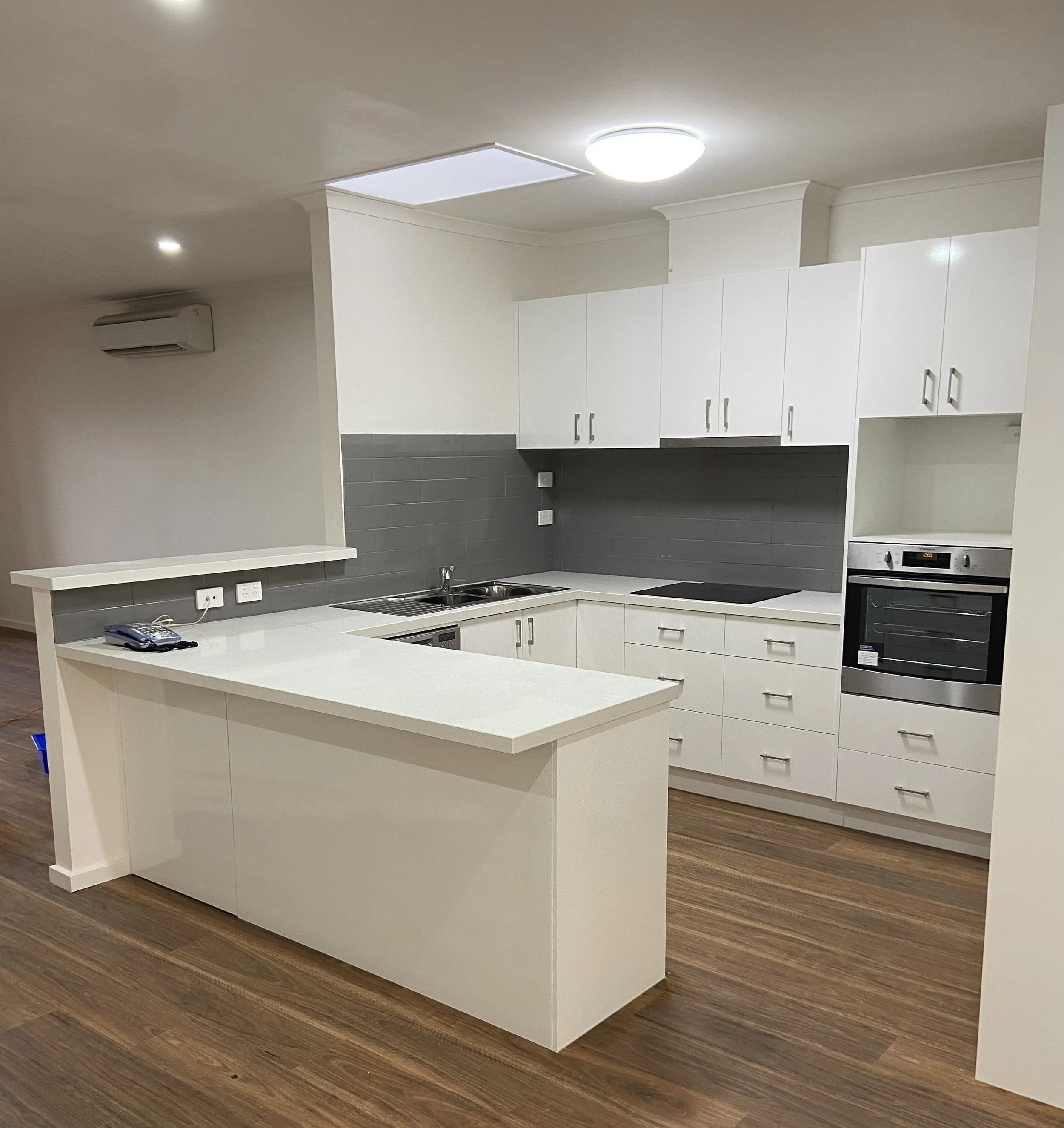 New kitchen with satin white cabinetry and softclose hardware